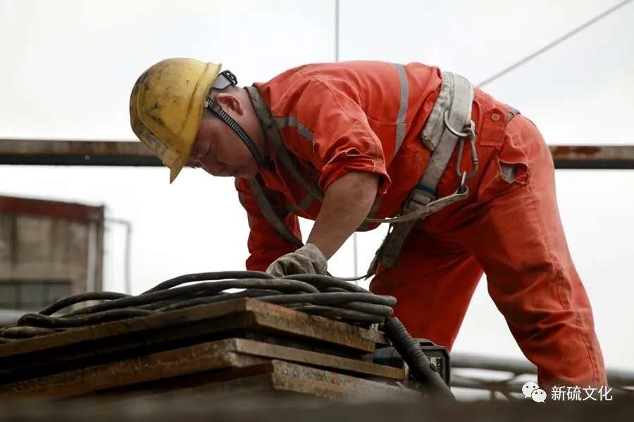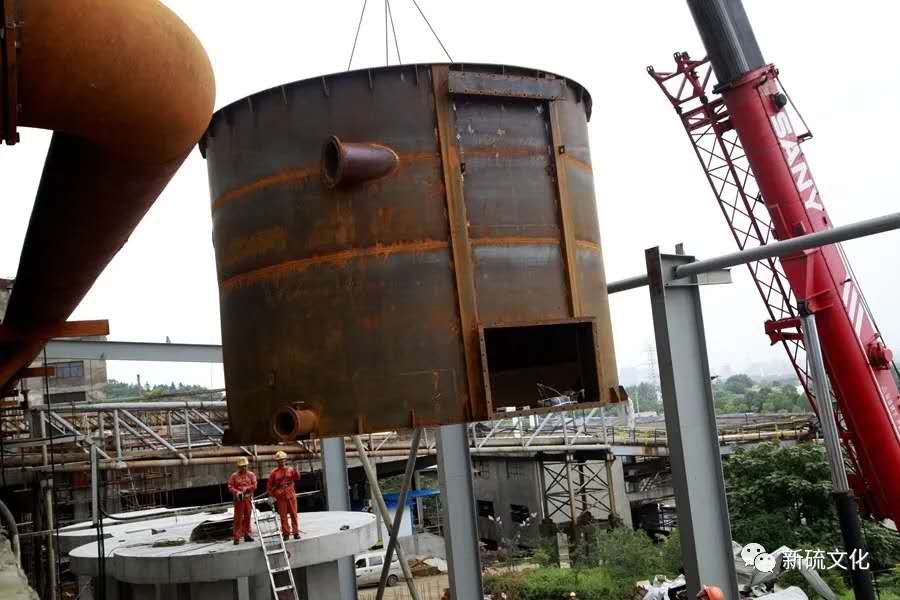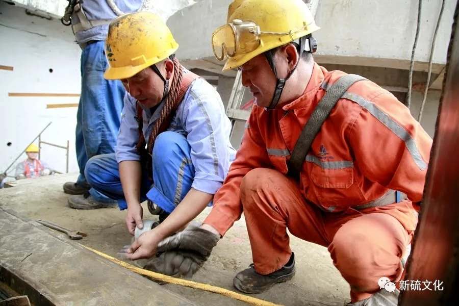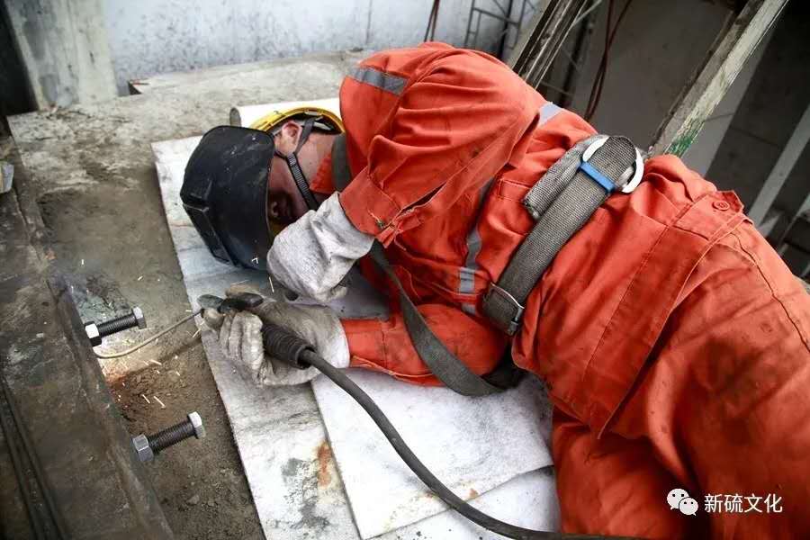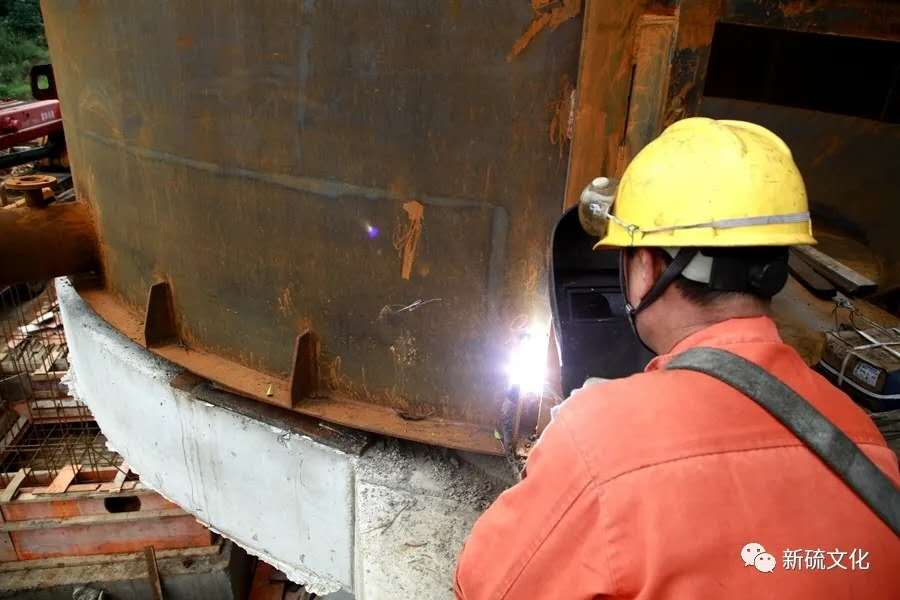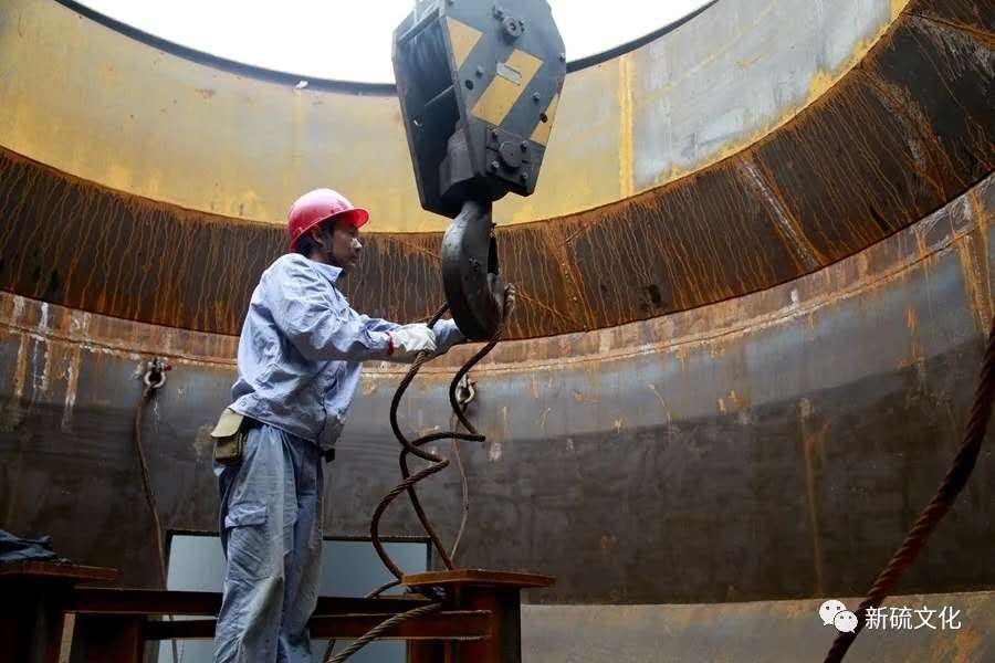 地面上大吊车、大货车,选矿厂相关负责人、技术人员、安全员等忙着起吊庞然大物时,“焊高组”在底座上也一刻没闲着,拖运电焊设备、准备焊接材料、在底座上铺水泥保持平面,各个槽体支脚找平衡......由于底座紧挨着磨浮车间,空气不流通,加上天气闷热难挡,武装整齐的好“焊”们一会就汗湿了工作服,汗珠顺着安全帽压着的发根往下滚。